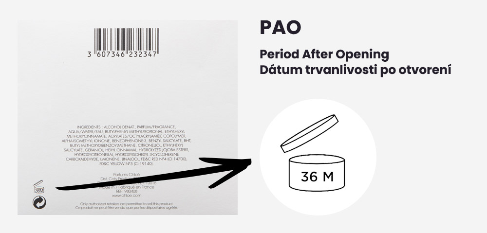 Na každém parfému byste navíc měli najít PAO – datum spotřeby. Označuje jej symbol otevřeného kelímku. Číslo, které v jeho blízkosti naleznete, vás informuje o počtu měsíců, po které si parfém zachová své vlastnosti i po otevření. Obvykle je to 30 měsíců.
