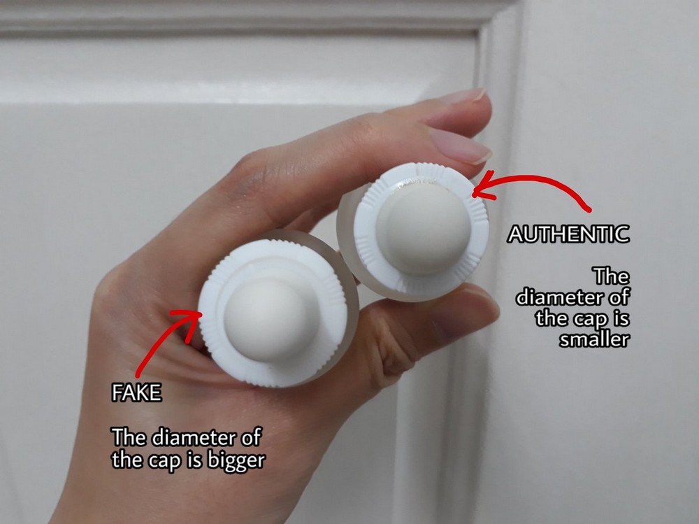 . Falešná suspenze měla řidší konzistenci, kterou pokožka neuměla vstřebat , originál měl hustší silikonovou konzistenci, která se téměř okamžitě vstřebala do pleti.