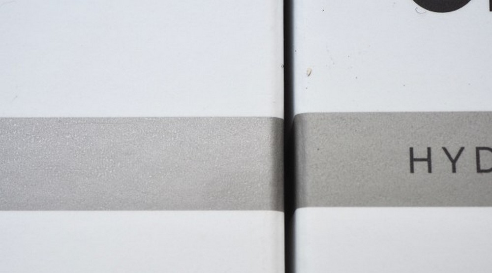 Kolem krabice (i lahvičky) je grafický prvek v podobě stříbrného proužku, který má kovový lesk, pokud jej držíte na světle. Falešné produkty mají obvykle šedý proužek bez očividného lesku.
